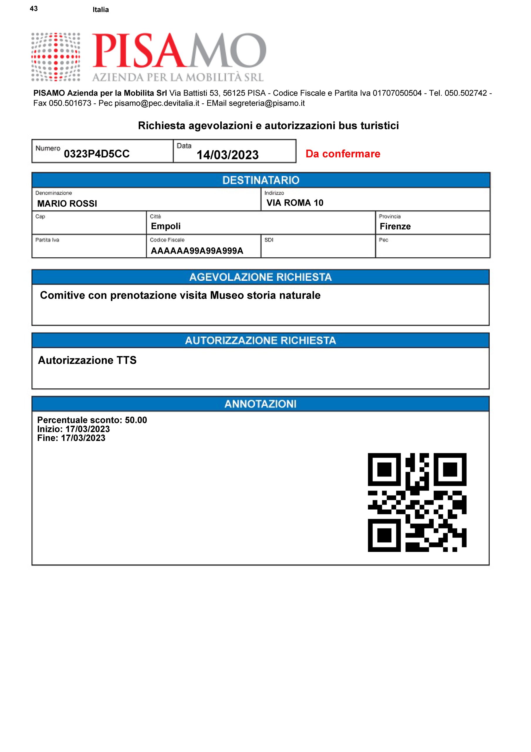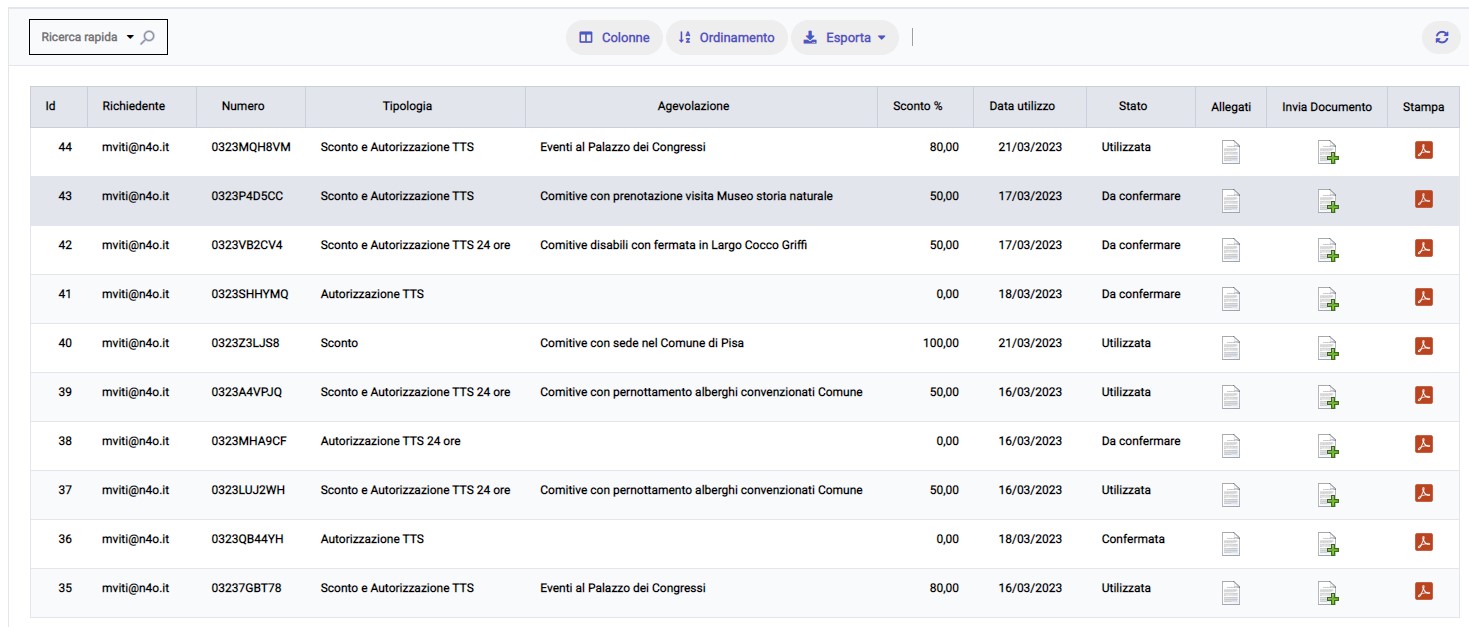 Ad ogni richiesta viene assegnato un numero che è il codice da inserire per poter effettuare la prenotazione o beneficiare della riduzione online o presentando il documento in pdf, anch’esso disponibile nella lista delle richieste, all’uopo generato.